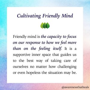 Instead of being taken over by the negative impacts of emotions, medications, hormones, chemistry, or circumstances, friendly mind—as the term suggests—supports us with our own befriending thoughts. Even though we will not always be able to feel friendly because of the depth of the difficulties we are facing, it’s possible to generate friendly guiding thoughts no matter what we feel.